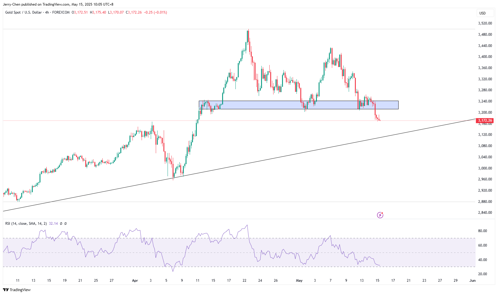 从4小时级别来看,跌破3200美元的关键支撑后,金价恐下探年初以来的上升探趋势线3125附近,空头在更下方的目标则为通道下轨2900美元附近。